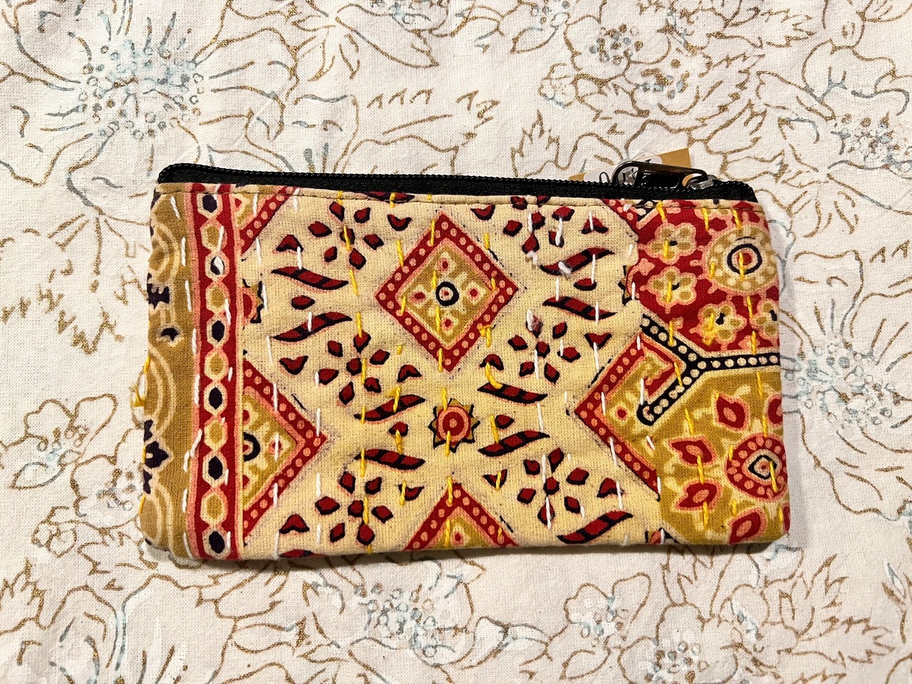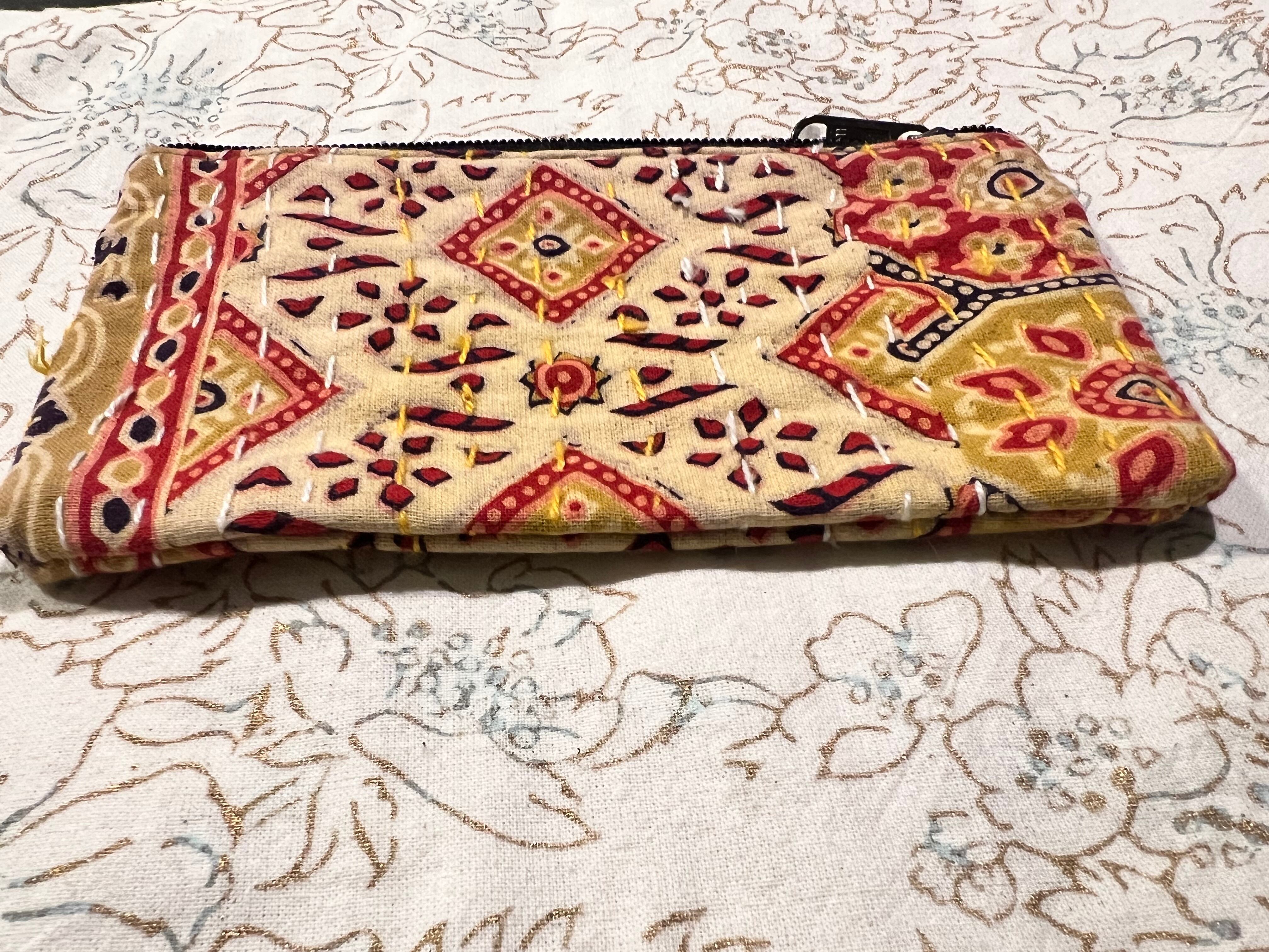 インド伝統のカンタ刺繍による、ランニング・ステッチが加わることで、立体感と、風合いが出てシックな色合いですがかわいい雰囲気のあるポーチになります。