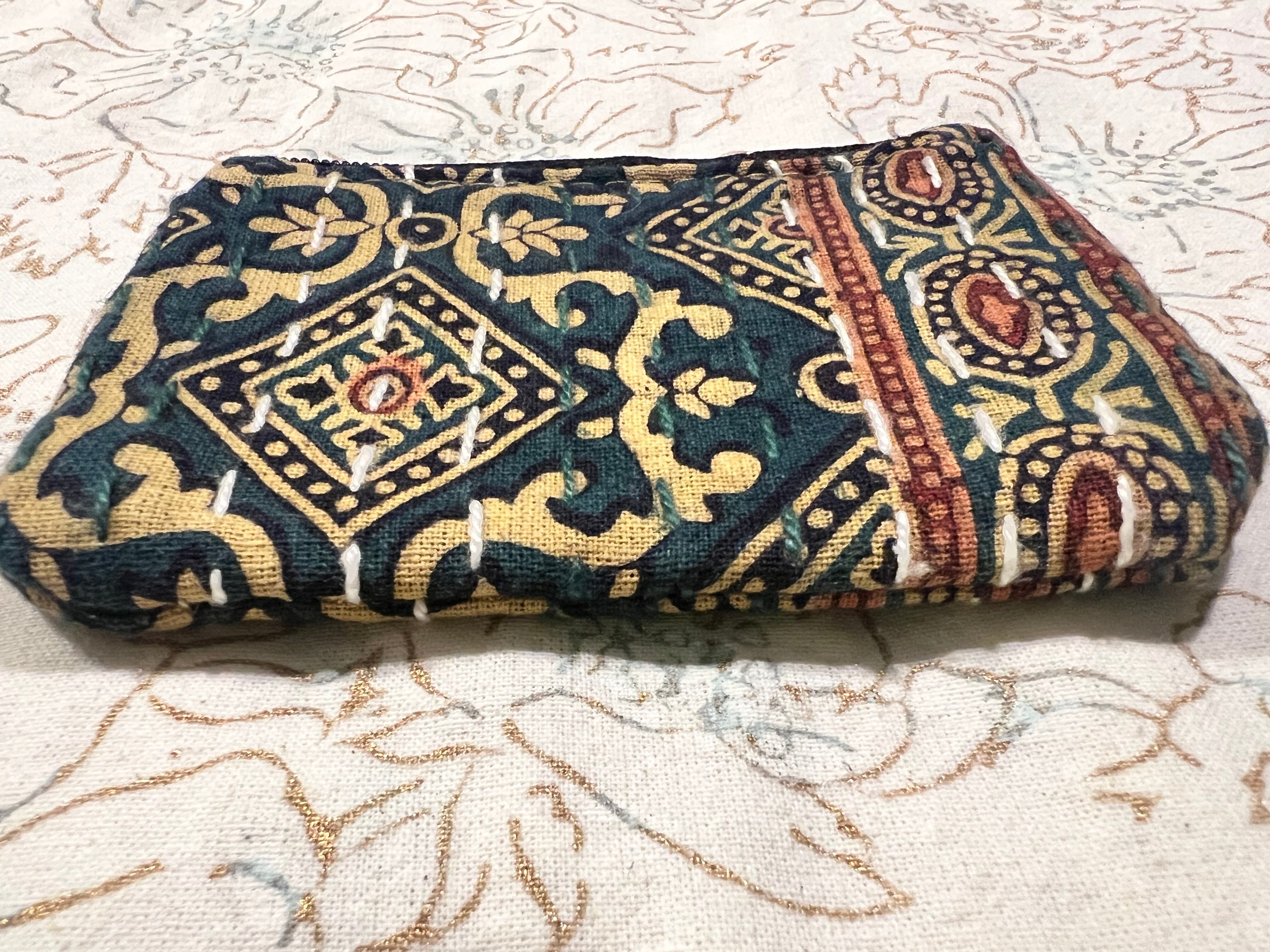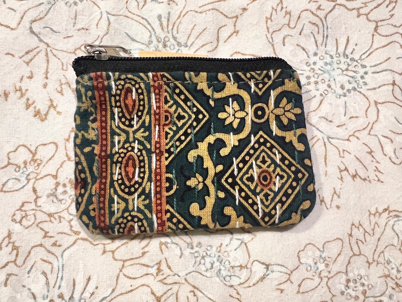 インド伝統のカンタ刺繍による、ランニング・ステッチが加わることで、立体感と、風合いが出てシックな色合いですがかわいい雰囲気のある小さいサイズのポーチになります。